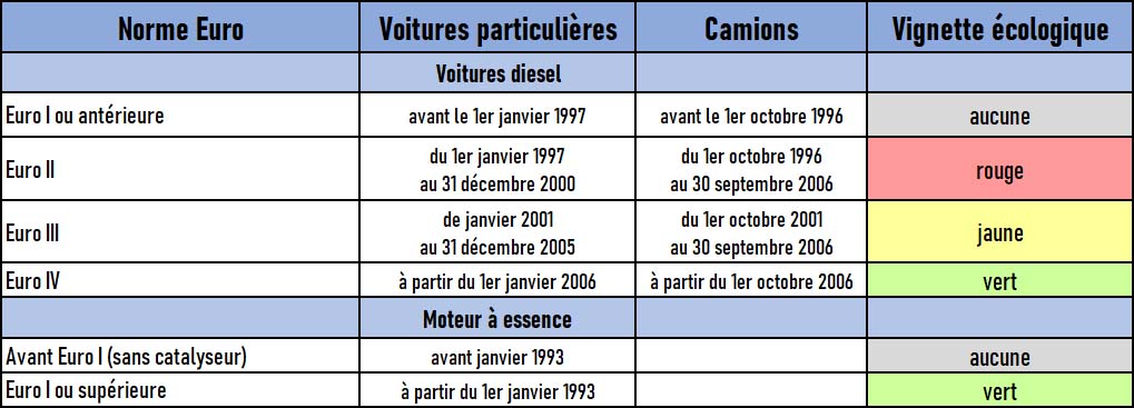 Vous pouvez facilement connaître le type de vignette écologique que vous pouvez obtenir pour votre véhicule en consultant le tableau récapitulatif ci-dessous. (Le niveau Euro représente la directive CEE/CE sur l’émission de polluants mentionnée dans votre document d’immatriculation.)