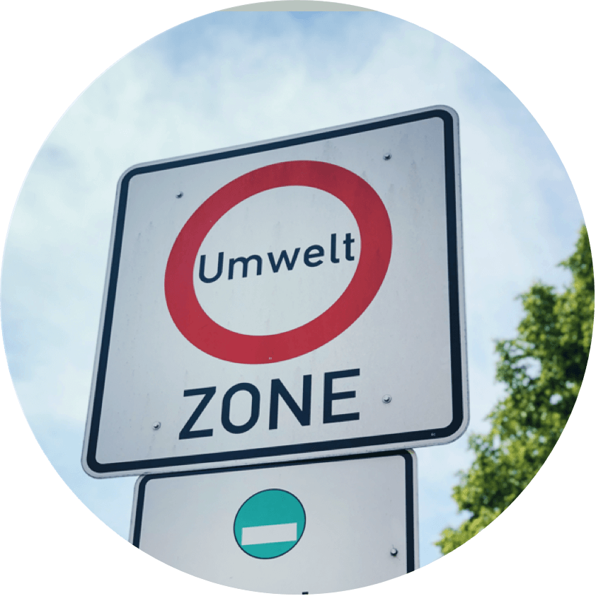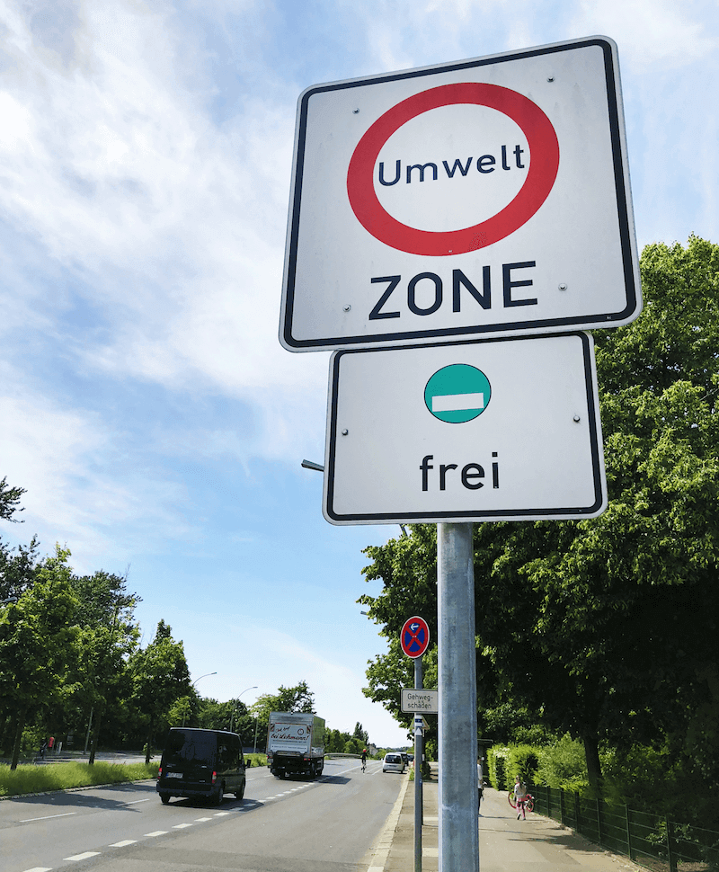 Les zones environnementales sont indiquées par des panneaux de signalisation portant la mention « Umwelt ZONE » comme vous pouvez le voir sur cette image. Un panneau supplémentaire portant la mention « frei » indique en outre le type de vignette écologique dont vous avez besoin.