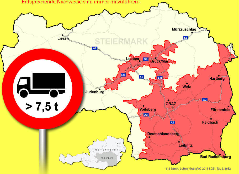 Depuis le 01/01/2014, une restriction s’applique aux véhicules des catégories N1, N2 et N3. L’accès est uniquement permis aux voitures correspondant à la classe d’émission EURO 3 et supérieure. Pour entrer dans la zone à faibles émissions de Styrie, une vignette de couleur Pickerl doit être apposée. Cette vignette indique la classe d’émission. Toute violation de cette obligation est sévèrement punie – l’amende peut aller jusqu’à 2,180 euros.