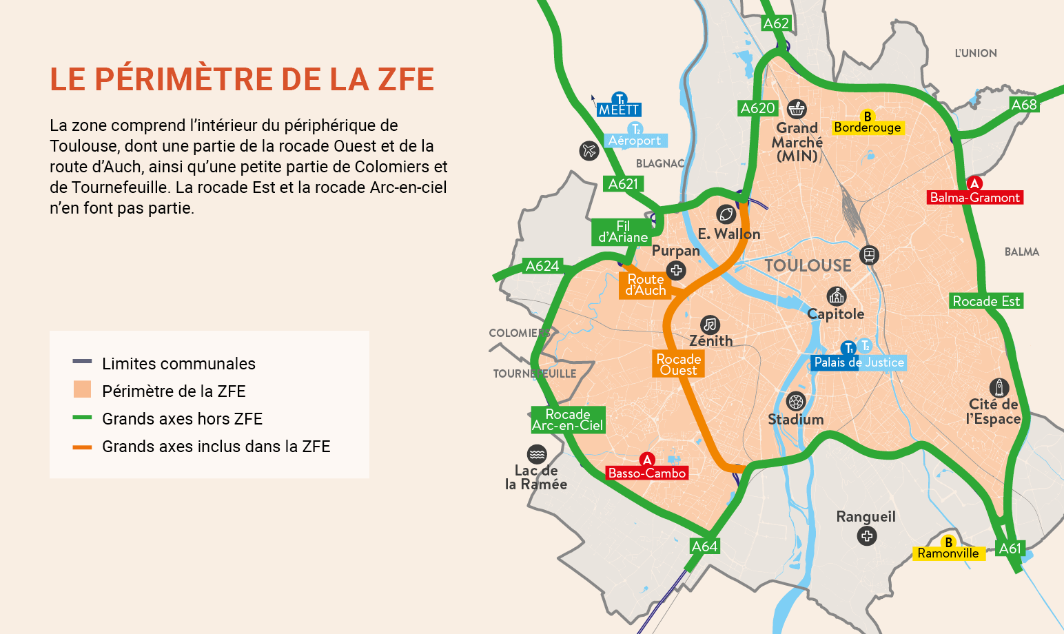 La zone à faibles émissions de Toulouse est bordée par le périphérique et elle couvre la majeure partie de la ville. Les autoroutes A62, A61 et A620 sont en dehors de la zone.